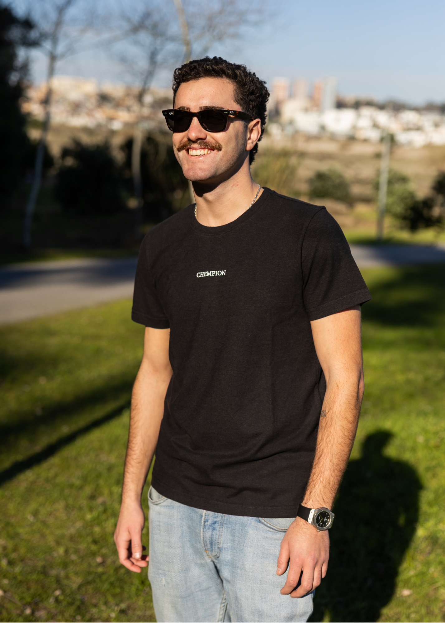 Black t-shirt model is 175cm wearing an L